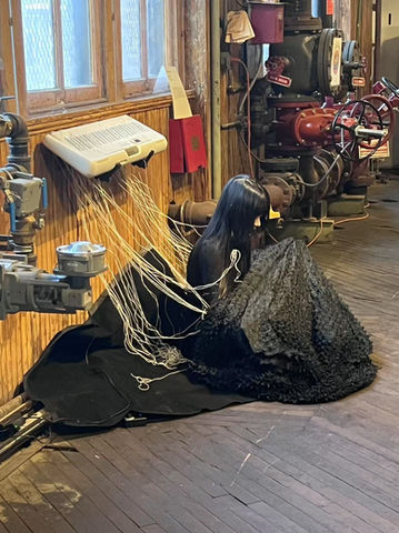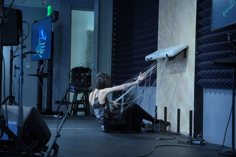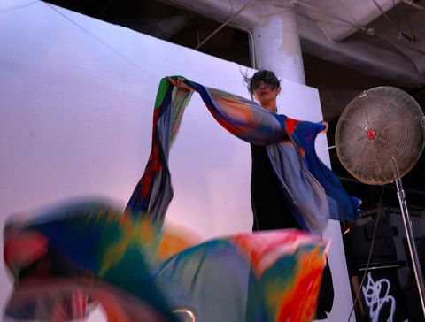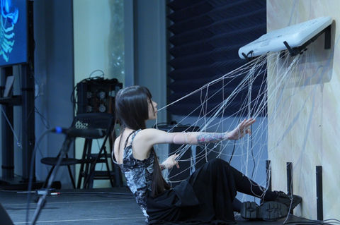 Using new media to create multiple selves sitting there with audiences, turning water to black marks on chemical cloth with aggressive movements.