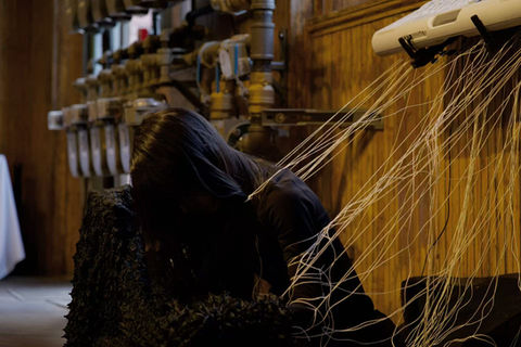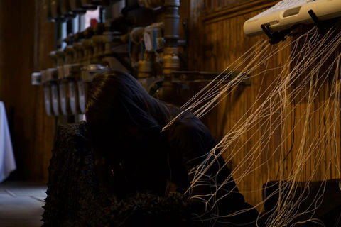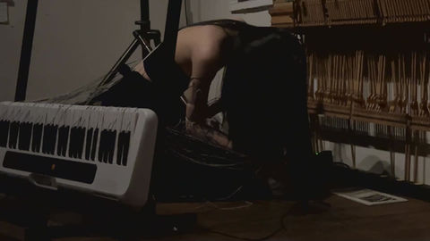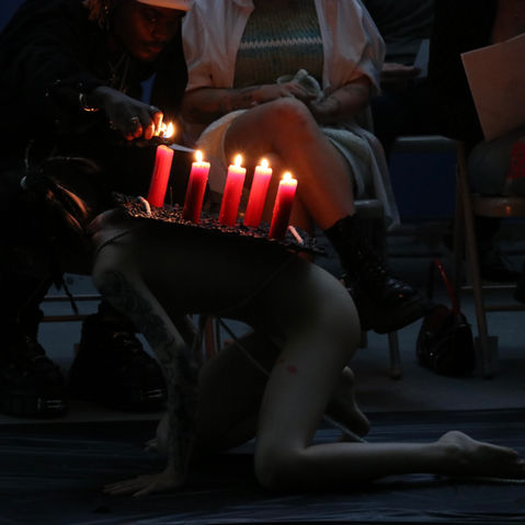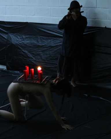 Crawling on the ground with buring candles on the back, interacting audiences. Audiences could decide whether light up the candles or blow them. The movement decided musician Hideo's melody.